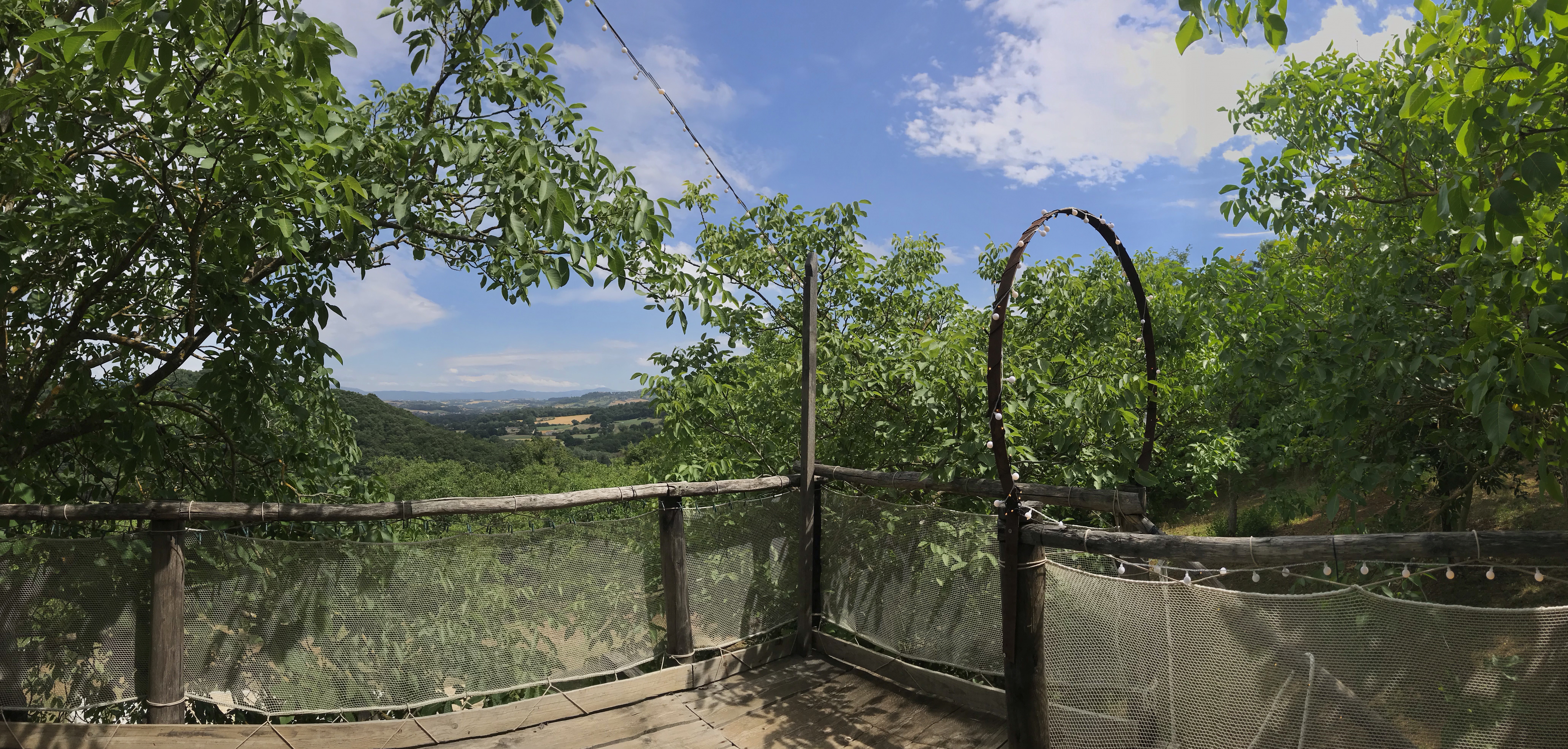 Vi invitiamo nella nostra azienda biologica per provare un’esperienza unica : una degustazione sulla nostra terrazza a 4 metri di altezza, in un bosco di noci con lo skyline di Todi baciato dal sole o illuminato dalla luna!… Assaporerete la vista, arricchirete il gusto, stupirete il tatto, delizierete l’olfatto e incanterete l’udito: scoprirete che i vostri sensi sono 5 e che potete usarli tutti nello spazio di una cena…. Un’esperienza che non dimenticherete !
